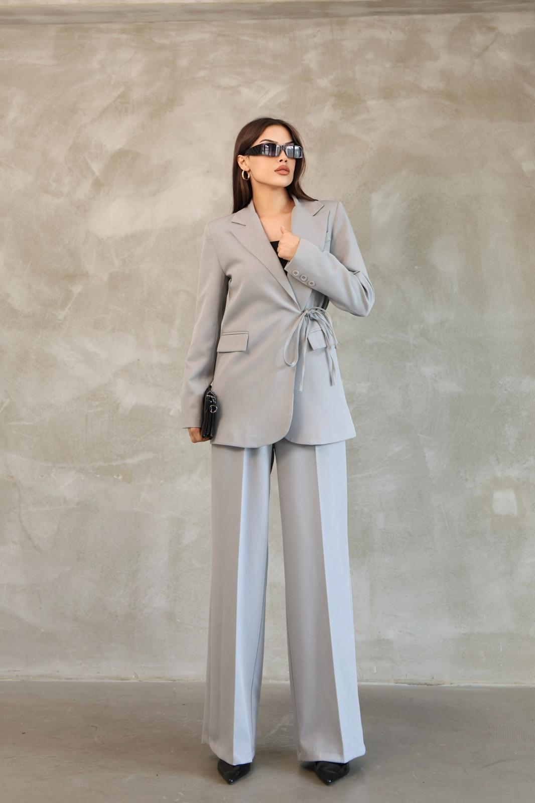 Kadın Gri Yandan Bağlamalı Blazer Ceket Pantolon Takım