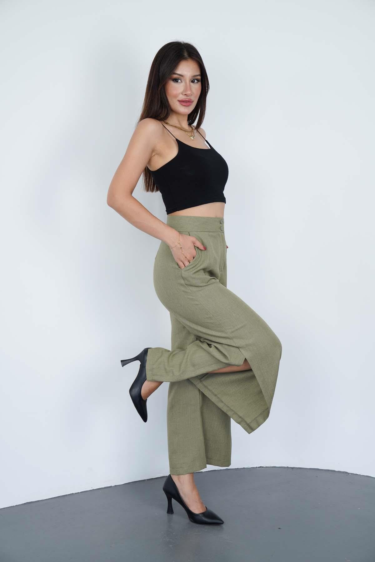 Kadın Haki Keten Yırtmaçlı Yüksek Bel Palazzo Pantolon (HZL2304)