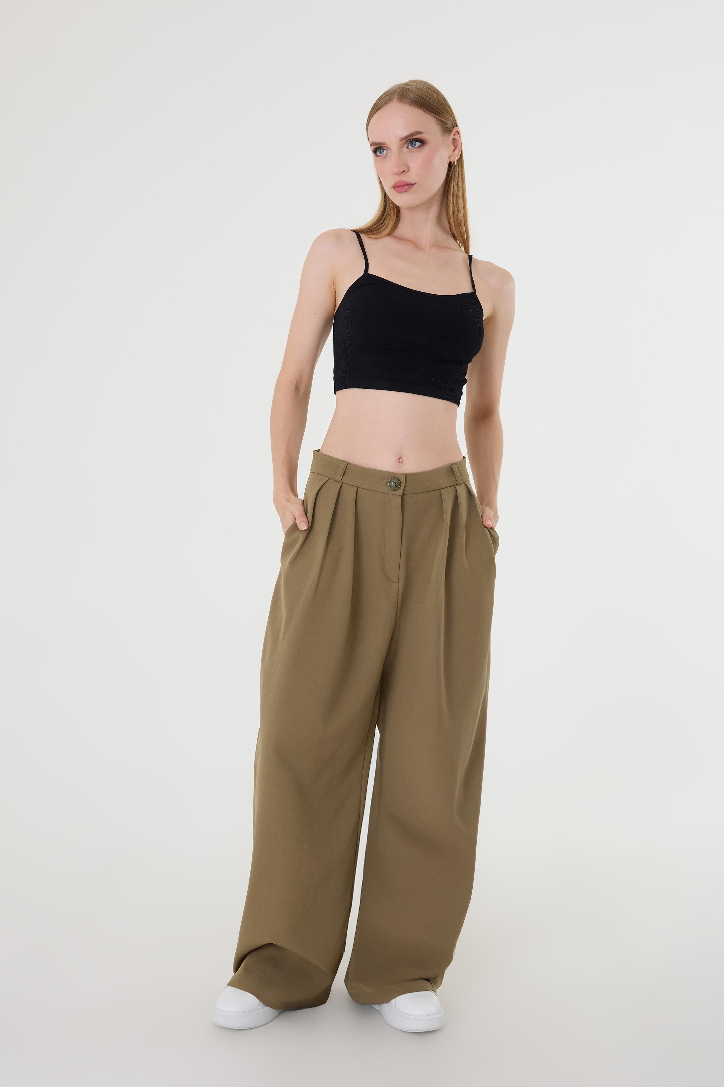 Kadın Haki Pile Detaylı Palazzo Pantolon (HZL6020)