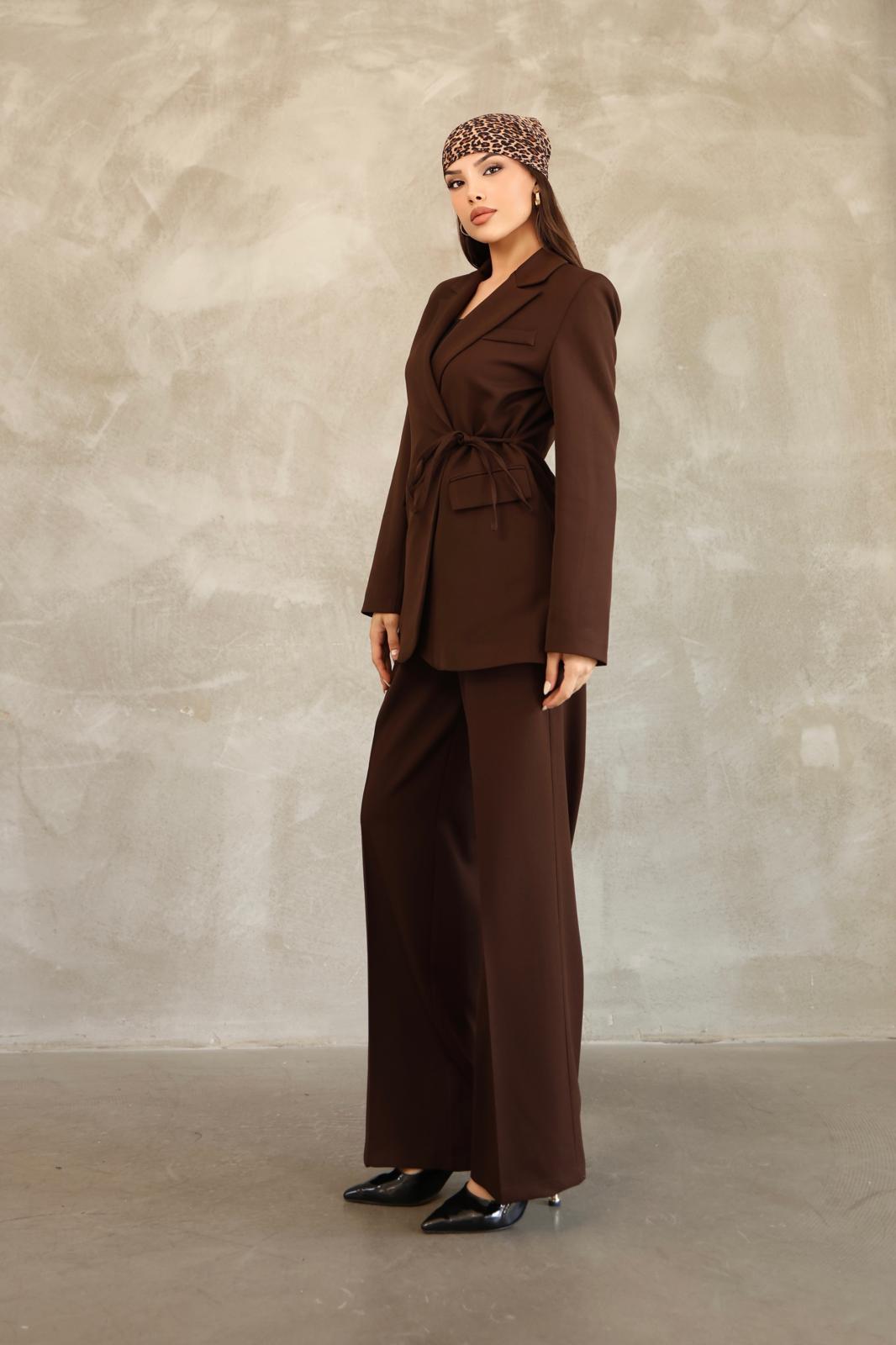 Kadın Kahverengi Yandan Bağlamalı Blazer Ceket Pantolon Takım (HZL4040)