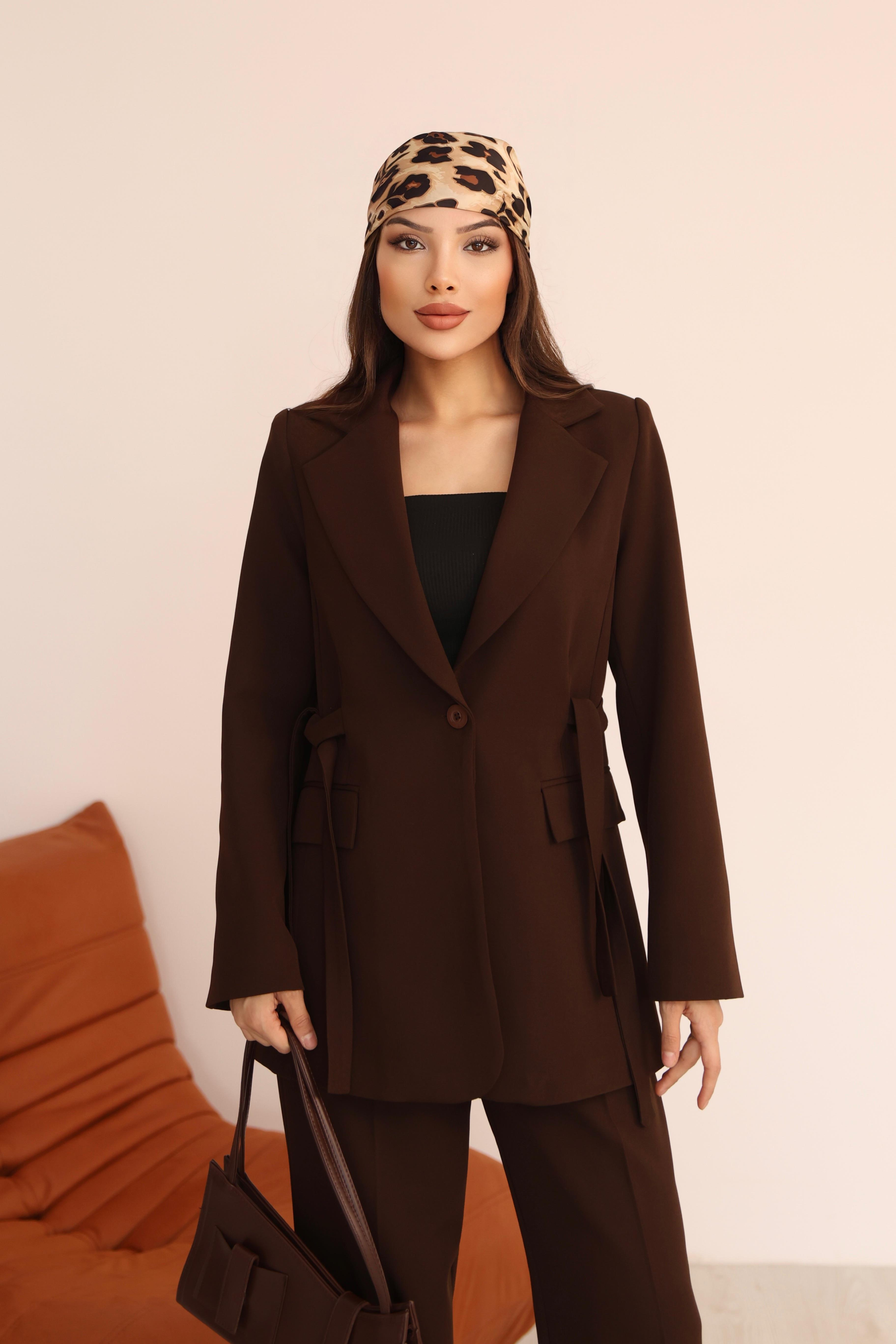 Kadın Kahverengi Yandan Kuşaklı Blazer Ceket Pantolon Takım (HZL4065)