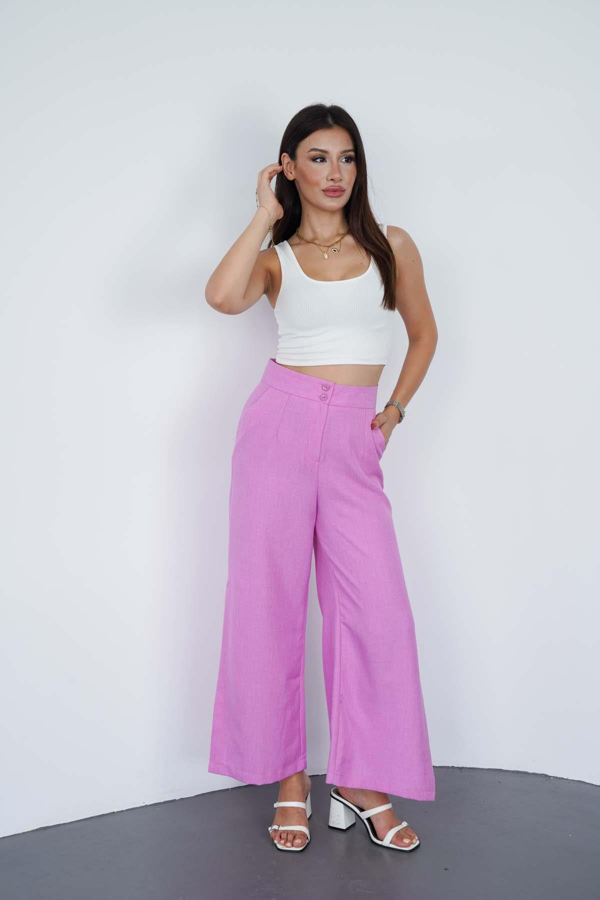 Kadın Pembe Keten Yırtmaçlı Yüksek Bel Palazzo Pantolon