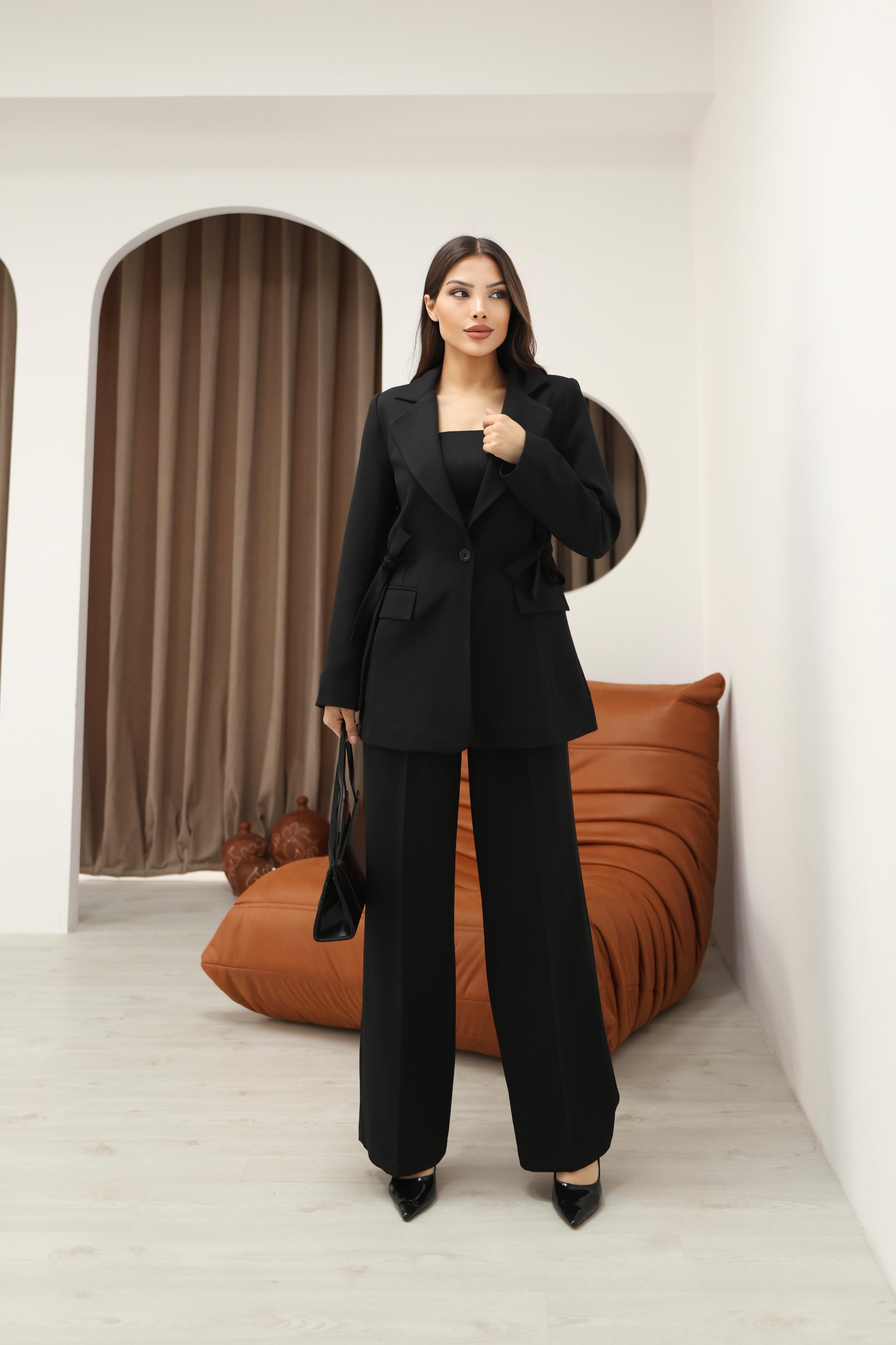 Kadın Siyah Yandan Kuşaklı Blazer Ceket Pantolon Takım (HZL4065)