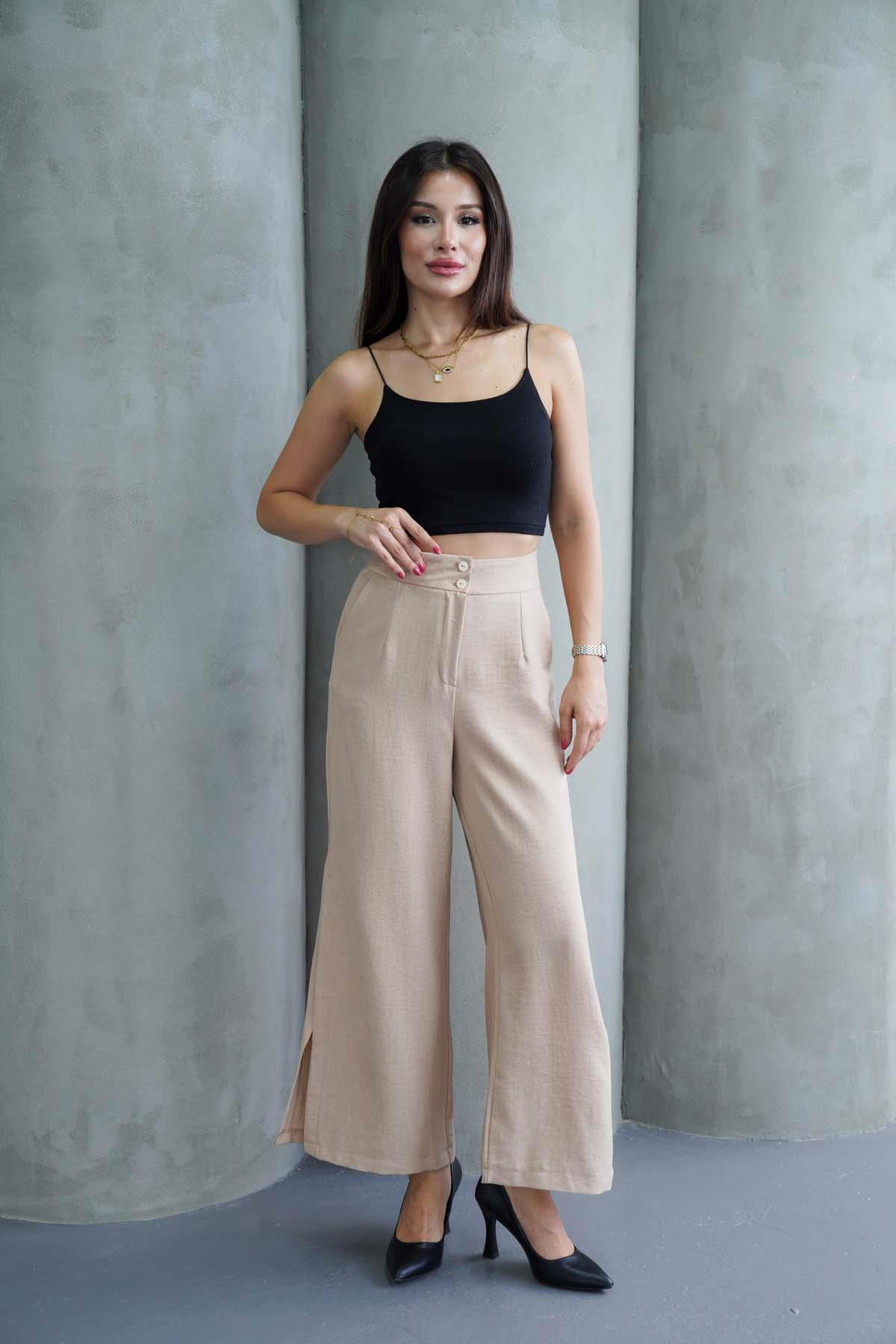 Kadın Taş Keten Yırtmaçlı Yüksek Bel Palazzo Pantolon (HZL2304I0V7789)