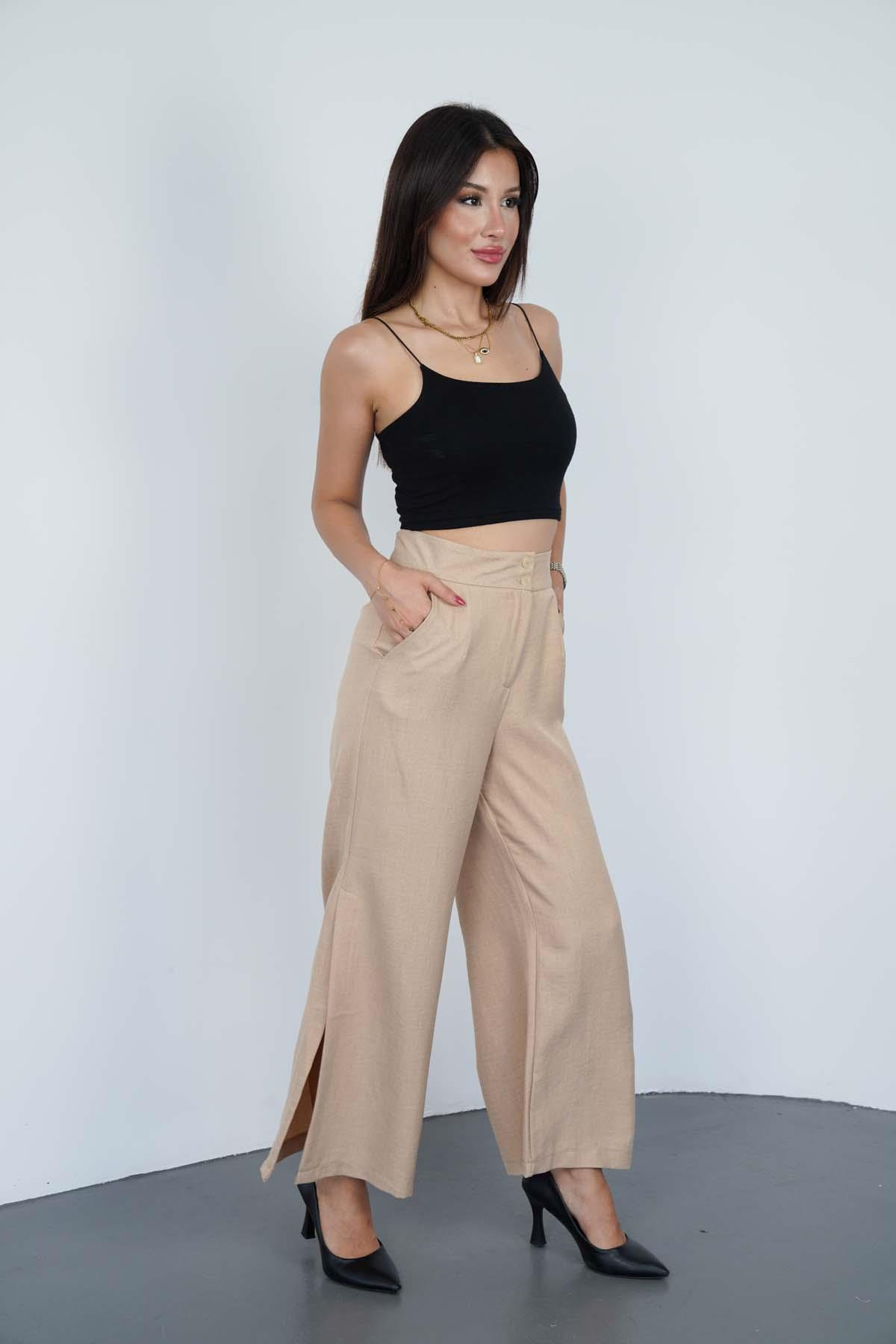 Kadın Vizon Keten Yırtmaçlı Yüksek Bel Palazzo Pantolon (HZL2304I0V9996)